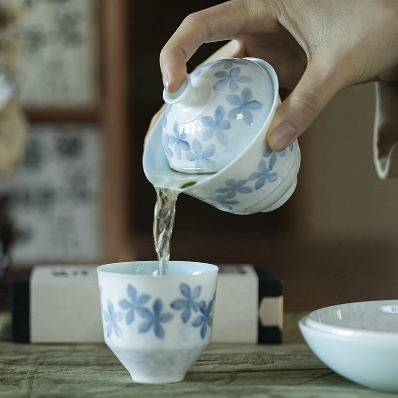 The gaiwan features a beautiful blue floral pattern, embodying simplicity and elegance. The blue flowers are evenly distributed across the surface, adding a touch of timeless beauty to your tea ritual. The minimalist design is perfect for those who appreciate both traditional and modern aesthetics. Ideal for brewing Pu-erh, Oolong, Green Tea, and other fine teas, this gaiwan enhances your tea brewing experience.